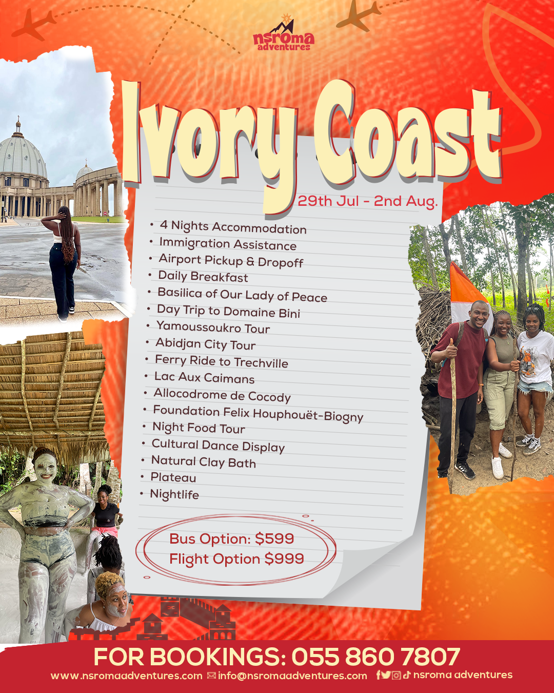 Experience the vibrant culture, rich history, and lively energy of Côte d’Ivoire. From grand basilicas and scenic lakes to bustling markets and exciting nightlife, enjoy guided tours, cultural performances, delicious local cuisine, and unforgettable moments in West Africa’s dynamic cities.